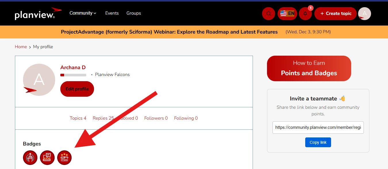 Every community member has a unique referral link available under “My Profile.” When someone joins through your link and their registration is approved, you earn 25 points. These points contribute toward badges, milestones, and a special Connect’26 reward.